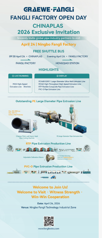अप्रिल 21 देखि 24 सम्म CHINAPLAS 2026 मा, बुथ 7.1C14 मा फङ्गली टेक्नोलोजीमा जानुहोस्। प्लास्टिक पाइप उपकरणमा नवीनता र भविष्यको सहयोग सँगै अन्वेषण गरौं!